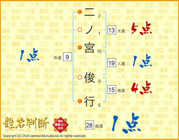 二(2画)ノ(1画)宮(10画) 俊(9画)行(6画)