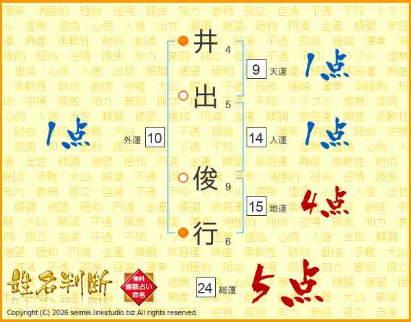 井(4画)出(5画) 俊(9画)行(6画)