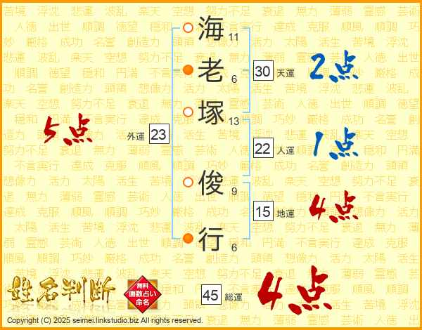 海(11画)老(6画)塚(13画) 俊(9画)行(6画)