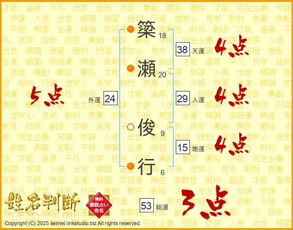 簗(18画)瀬(20画) 俊(9画)行(6画)