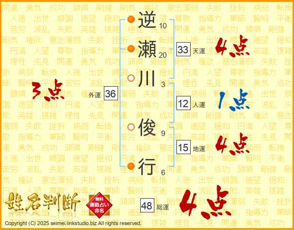 逆(10画)瀬(20画)川(3画) 俊(9画)行(6画)