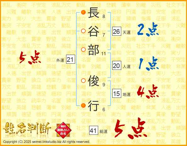 長(8画)谷(7画)部(11画) 俊(9画)行(6画)