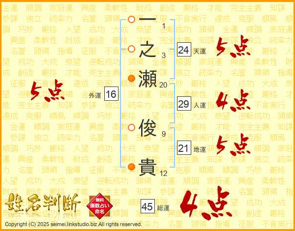 一(1画)之(3画)瀬(20画) 俊(9画)貴(12画)