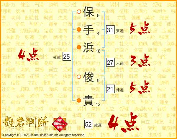 保(9画)手(4画)浜(18画) 俊(9画)貴(12画)