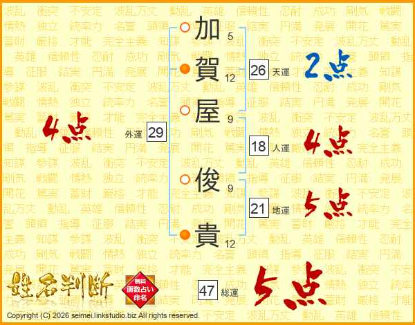 加(5画)賀(12画)屋(9画) 俊(9画)貴(12画)