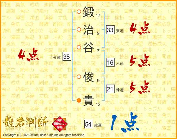 鍛治谷俊貴さんの天運は33画の4点!