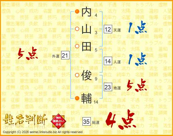 内(4画)山(3画)田(5画) 俊(9画)輔(14画)