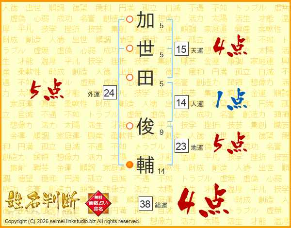 加(5画)世(5画)田(5画) 俊(9画)輔(14画)
