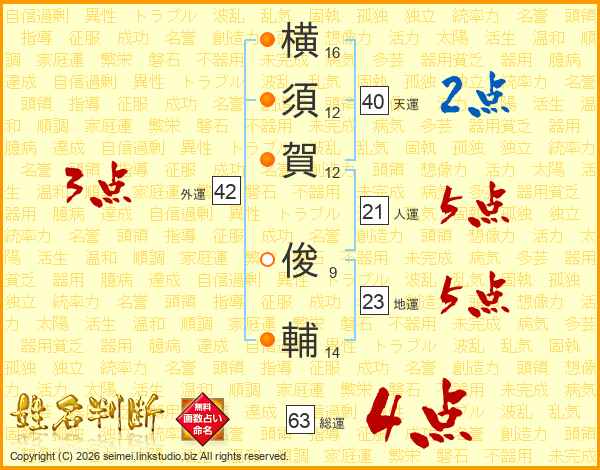 横(16画)須(12画)賀(12画) 俊(9画)輔(14画)