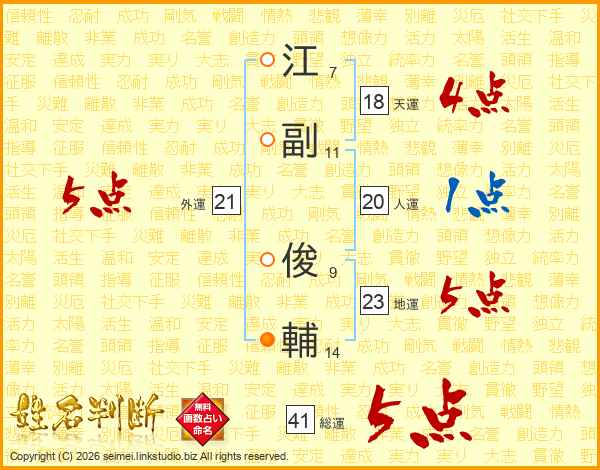 生活面を象徴する運勢です。外部から受ける影響力を表し、結婚運、家庭運や職場、環境への順応性を表します。総運から人運を引いた画数。姓や名が1文字の場合を除く。