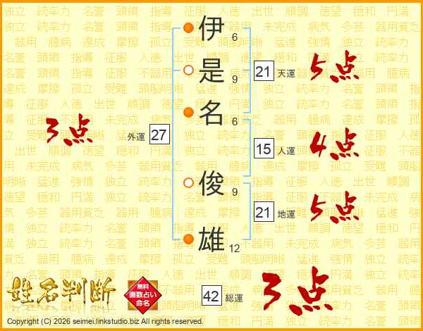 伊(6画)是(9画)名(6画) 俊(9画)雄(12画)