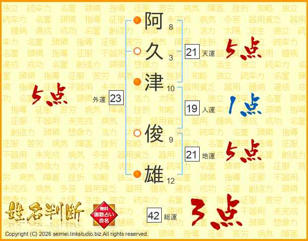 阿久津俊雄さんの天運は21画の5点!
