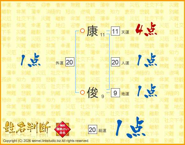 康(11画) 俊(9画)