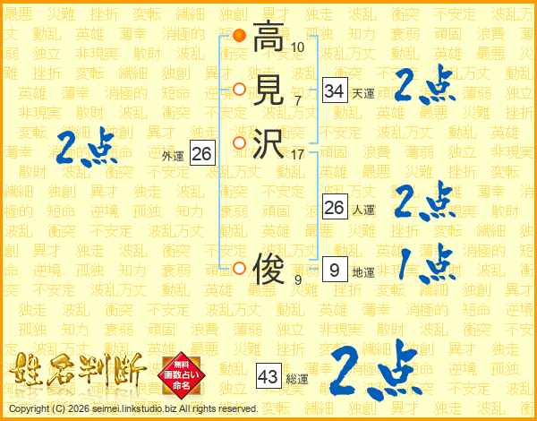あなたの人生を表す1番重要な運勢です。生涯を通じて影響する総合運となり、主に50歳以降の晩年期に影響を及ぼします。苗字と名前の合計画数。