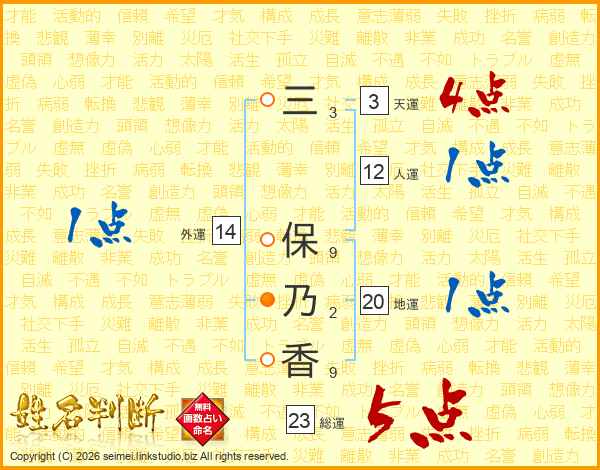 生活面を象徴する運勢です。外部から受ける影響力を表し、結婚運、家庭運や職場、環境への順応性を表します。総運から人運を引いた画数。姓や名が1文字の場合を除く。