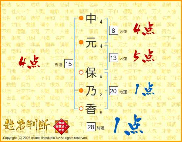中(4画)元(4画) 保(9画)乃(2画)香(9画)