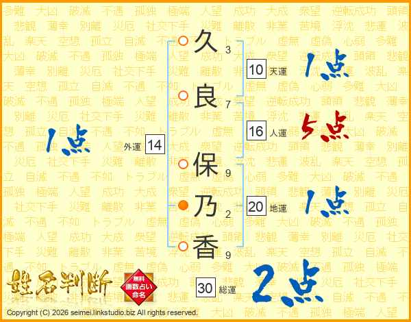 久(3画)良(7画) 保(9画)乃(2画)香(9画)