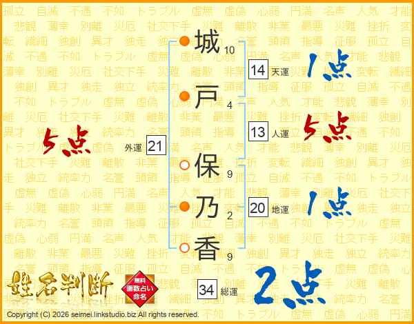 城(10画)戸(4画) 保(9画)乃(2画)香(9画)