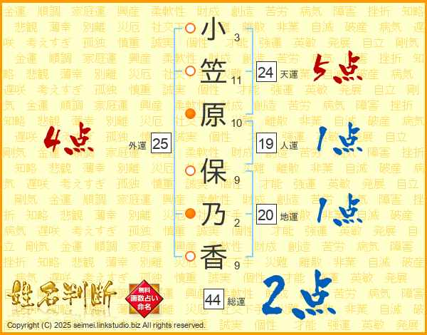 小(3画)笠(11画)原(10画) 保(9画)乃(2画)香(9画)