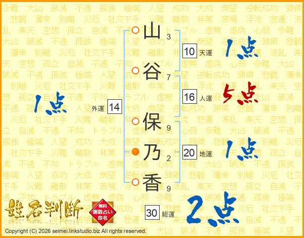 山(3画)谷(7画) 保(9画)乃(2画)香(9画)