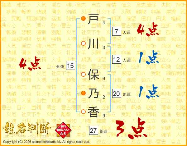 戸(4画)川(3画) 保(9画)乃(2画)香(9画)