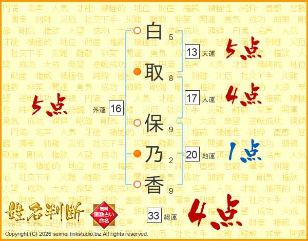 白(5画)取(8画) 保(9画)乃(2画)香(9画)
