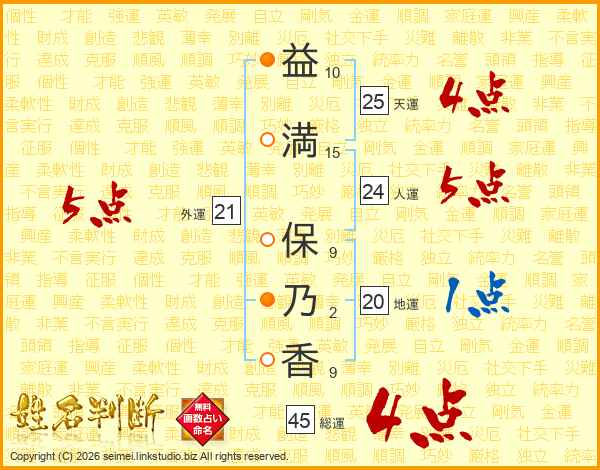 益(10画)満(15画) 保(9画)乃(2画)香(9画)