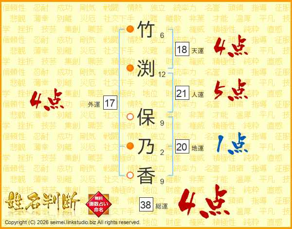 竹(6画)渕(12画) 保(9画)乃(2画)香(9画)