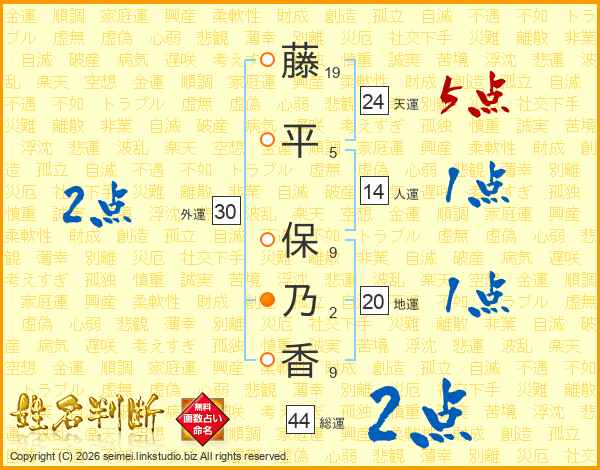 藤(19画)平(5画) 保(9画)乃(2画)香(9画)