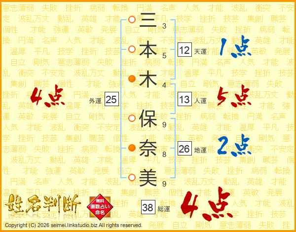 三(3画)本(5画)木(4画) 保(9画)奈(8画)美(9画)
