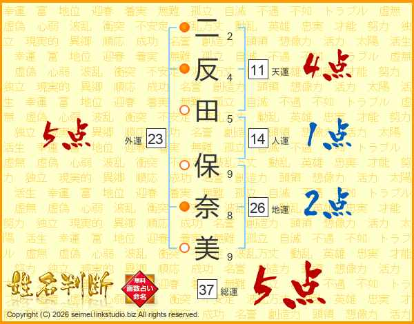 生活面を象徴する運勢です。外部から受ける影響力を表し、結婚運、家庭運や職場、環境への順応性を表します。総運から人運を引いた画数。姓や名が1文字の場合を除く。