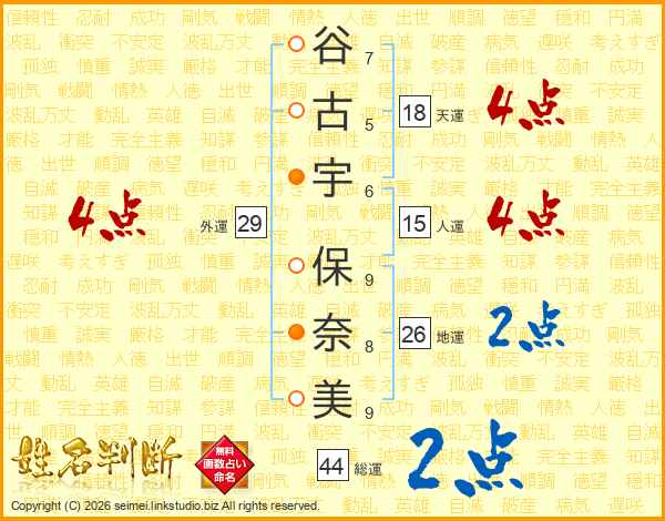 谷(7画)古(5画)宇(6画) 保(9画)奈(8画)美(9画)