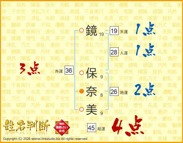 鏡(19画) 保(9画)奈(8画)美(9画)