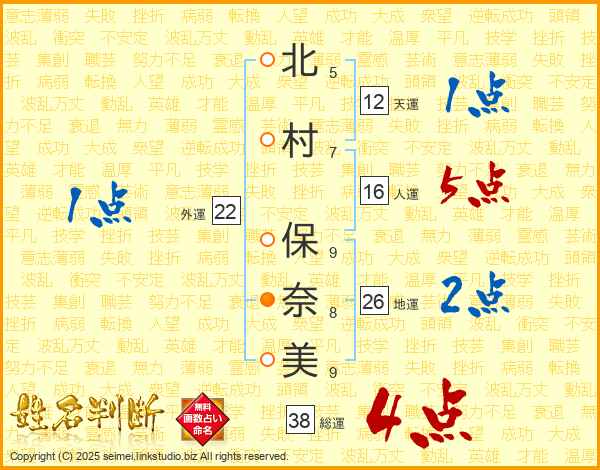 北(5画)村(7画) 保(9画)奈(8画)美(9画)