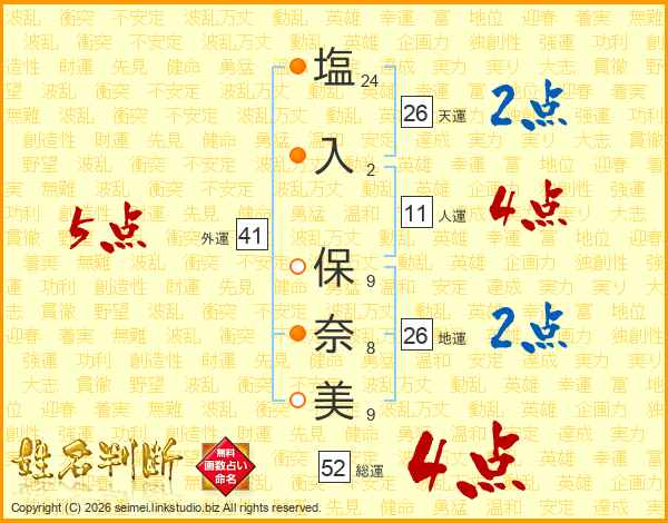 塩(24画)入(2画) 保(9画)奈(8画)美(9画)