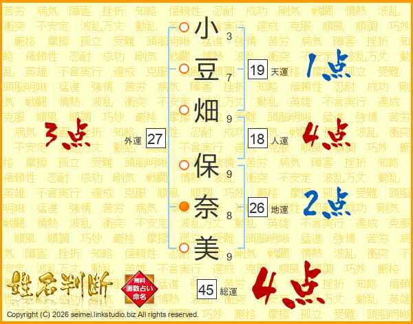 小(3画)豆(7画)畑(9画) 保(9画)奈(8画)美(9画)