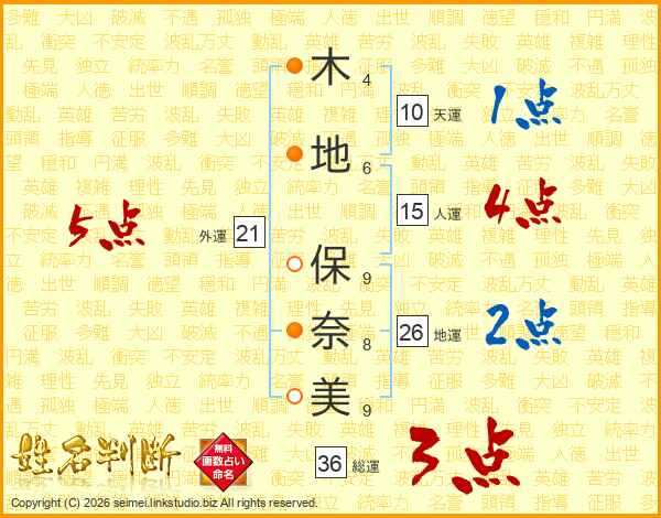 木(4画)地(6画) 保(9画)奈(8画)美(9画)