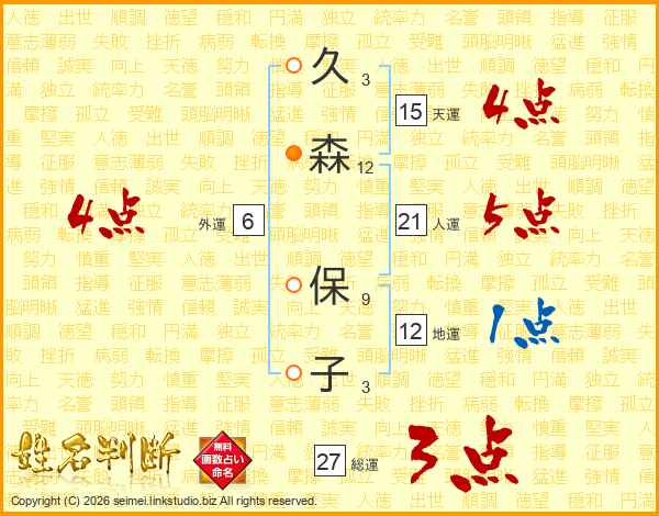 久(3画)森(12画) 保(9画)子(3画)