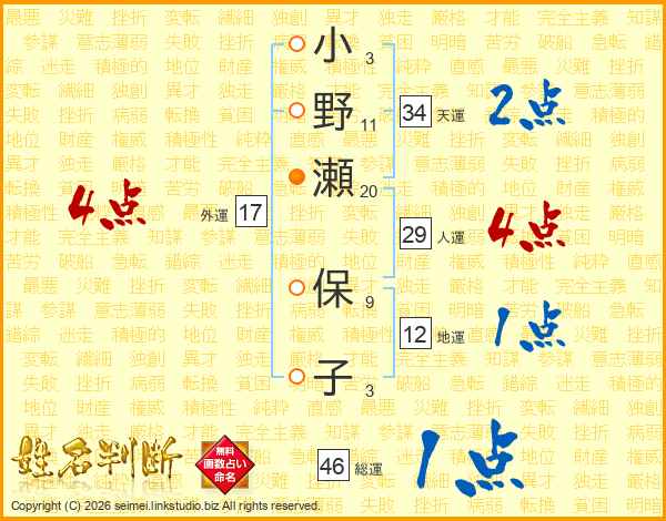 小(3画)野(11画)瀬(20画) 保(9画)子(3画)