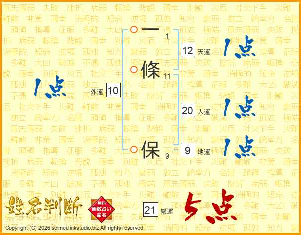 あなたの人生を表す1番重要な運勢です。生涯を通じて影響する総合運となり、主に50歳以降の晩年期に影響を及ぼします。苗字と名前の合計画数。