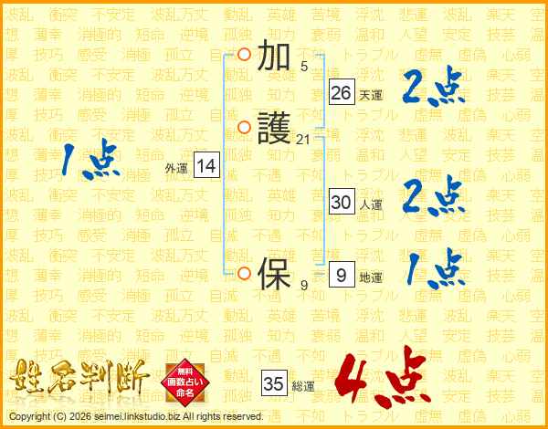 生活面を象徴する運勢です。外部から受ける影響力を表し、結婚運、家庭運や職場、環境への順応性を表します。総運から人運を引いた画数。姓や名が1文字の場合を除く。