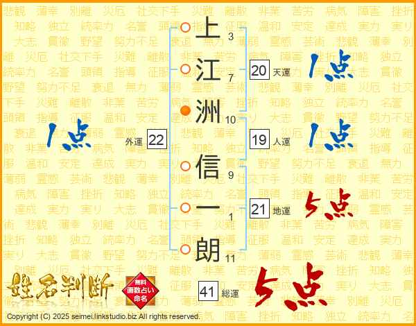 あなたの人生を表す1番重要な運勢です。生涯を通じて影響する総合運となり、主に50歳以降の晩年期に影響を及ぼします。苗字と名前の合計画数。