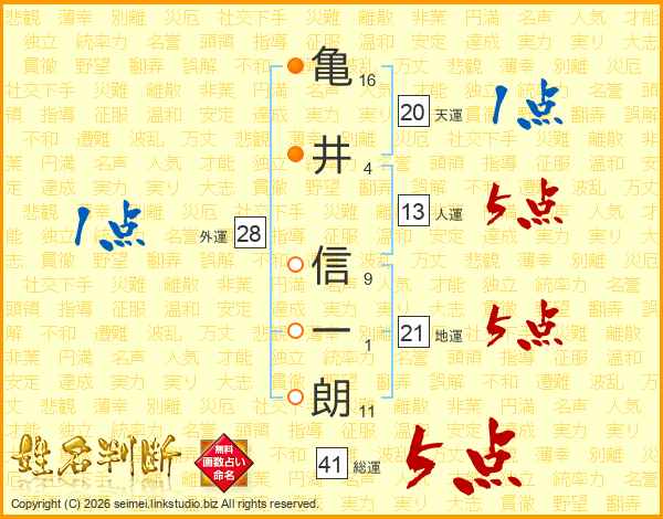 亀(16画)井(4画) 信(9画)一(1画)朗(11画)