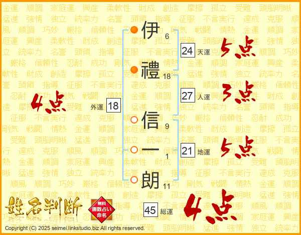 伊(6画)禮(18画) 信(9画)一(1画)朗(11画)