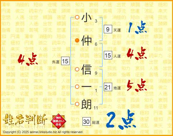小(3画)仲(6画) 信(9画)一(1画)朗(11画)