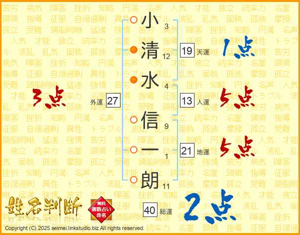小(3画)清(12画)水(4画) 信(9画)一(1画)朗(11画)