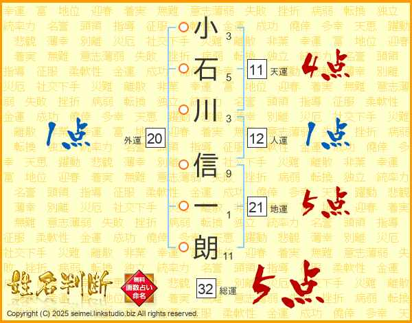 小(3画)石(5画)川(3画) 信(9画)一(1画)朗(11画)