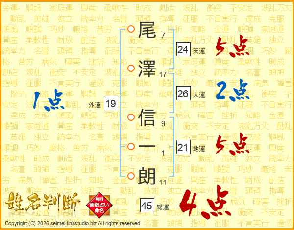 尾澤信一朗さんの総運は45画の4点!