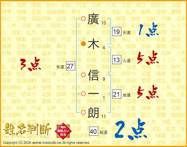 廣(15画)木(4画) 信(9画)一(1画)朗(11画)