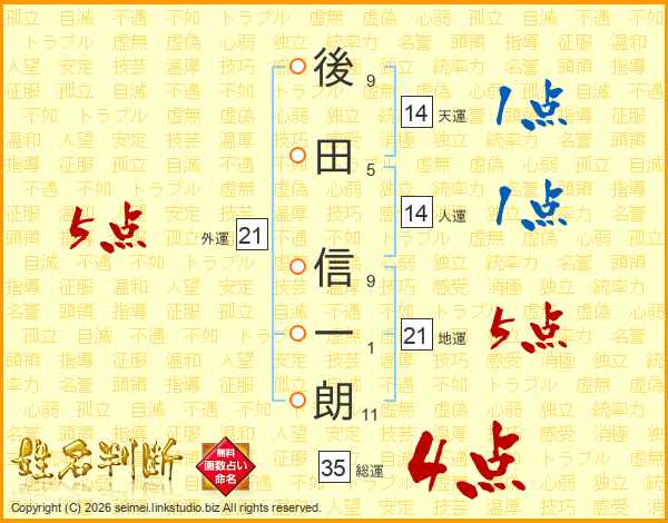 後(9画)田(5画) 信(9画)一(1画)朗(11画)